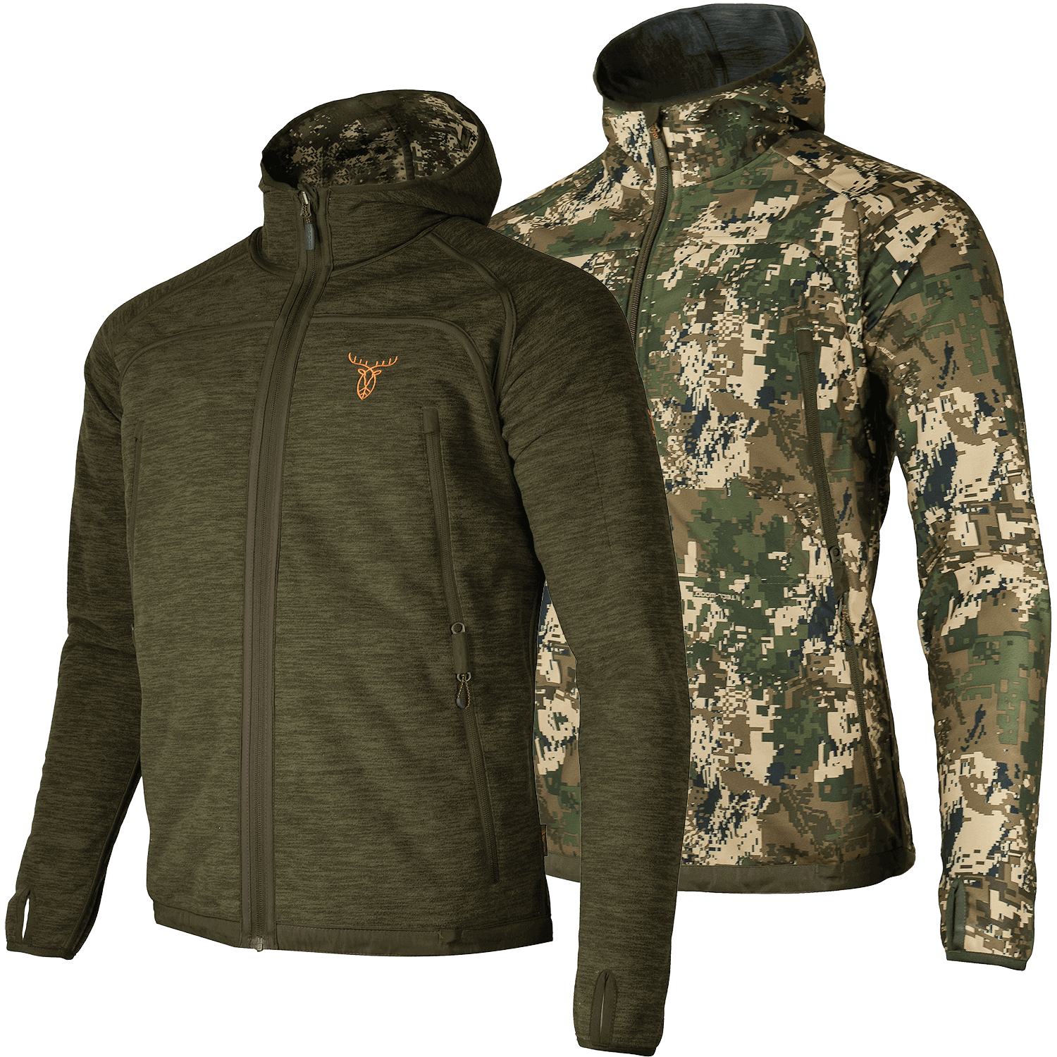 The fleece jacket has a total of nine pockets: Four zipped pockets each on the green and camo sides, as well as a practical sleeve pocket.